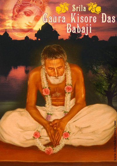 In 1908 Gaura Kisora dasa Babaji Maharaja lost his external eye sight, so he then stopped travelling and just chanted and performed worship of krishna. Being aloof from external consciousness, sometimes he would not dress his body instead he would sit in his bhajan kutir internally absorbed in krishna's pastimes and in a very deep voice be heard calling the names of the gopis of Vrindavana.